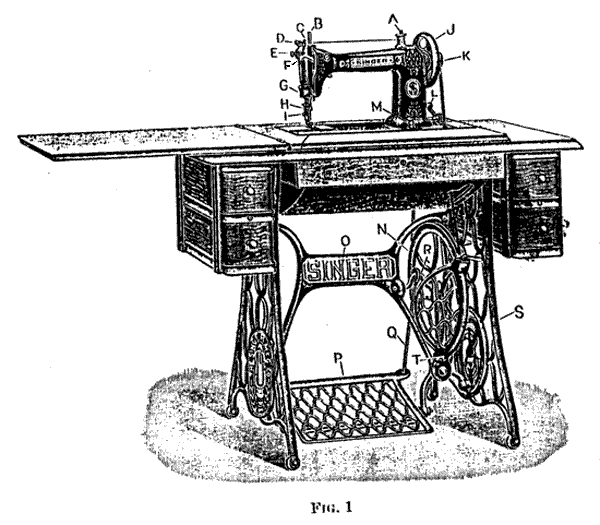 Place the spool on the spool pin, pas the thread under the thread retainer guide wire through thread retainer (A), down in front and once around tension pulley (B), thence under thread controller spring (C), up into take-up lever (D), down to thread leader (E) and needle bar thread guide (F) to the needle; then thread the needle from right to left, as shown in Fig 7, and draw two or three inches of thread through the eye of the needle when the take-up lever is at its highest point. Do not let thread retainer (A) or the groove in the tension pulley become clogged with lint, dirt or knots of thread. In using fine silk, wind it twice around the tension pulley should it slip without turning the pulley.