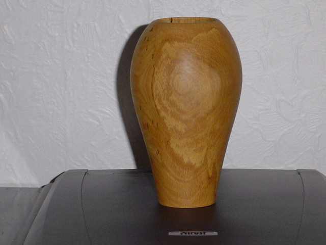 The picture shows a vase I made, possibly a couple of years or so ago, from beech that was almost paper white. Look at the colour now, after two years in our conservatory. What colour will it be in 100 years time? The patina is only on the surface. If I were to cut away four or five thousandths of an inch of the wood (easily done with abrasive paper), it would be white again. Lesson: – don’t go mad with the abrasives! Sometimes we’ll have to abrade through the patina – but we’ll avoid it where we can.