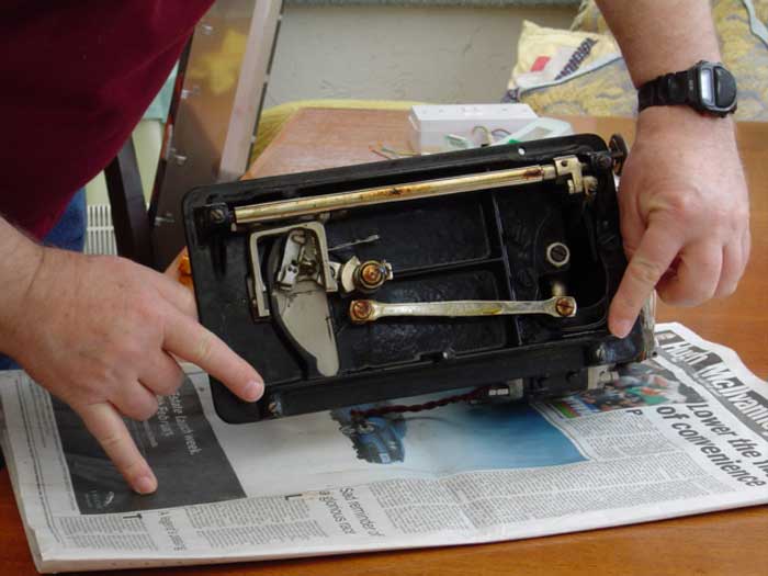 The first thing to do is to remove the head from the base. Invariably, the head is retained by two fixings. These clamp onto pegs that stick out from the hinges and allow the head to be tilted back. These are difficult to photograph while the head’s still in place because on some machines, this one included, the head doesn’t tilt back very far. I therefore removed the head before taking this picture to show their position.