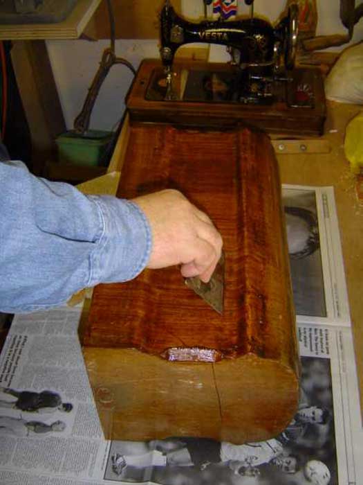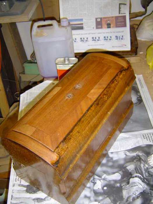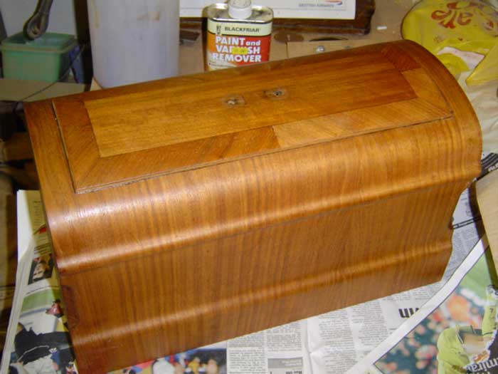 One very important thing to say to you at this point – don’t ever try to remove the old finish by sanding it off! That veneer is very thin – typically about one millimetre – and the old finish won’t have a consistent hardness or thickness over the whole of its surface, so if you try to sand it off, you’ll be through the veneer in some places before you’re through the varnish in others! Result – one scrap sewing machine cover! You’ve been warned!