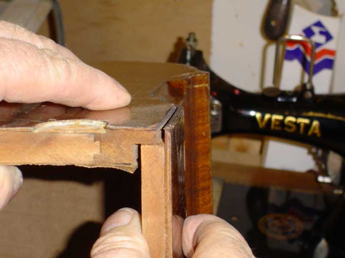 Whilst we’re looking at the picture, this is a good opportunity to explain something about veneer. Can you see that there’s some veneer coming away on the inside of the case? “So why did they bother to veneer it on the inside?” I hear you all ask. Well, when we glue a piece of veneer to one side of a piece of wood, the veneer is wet from the glue and has therefore expanded across its grain (remember the bit about wood expansion and contraction in the last article?). When it dries, it shrinks again, and this contraction will exert quite enough force to cause even a fairly thick piece of timber to bow over time. To prevent this from happening, it is normal to veneer both sides of the wood at the same time, thus causing the shrinkage forces to work in opposition to each other. Needless to say, whilst the veneer on the outside is cut from some attractive wood, the inside veneer can be any old rubbish – as long as it has similar expansion and contraction characteristics to the outer veneer. Take a look under one of your veneered treadle tables – you’ll find that it’s also veneered on the underside for this very reason.