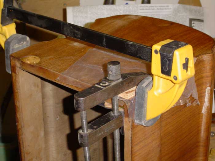 Just to talk you through the arrangement shown above: the large clamp with the yellow ends is holding the main joint closed; the smaller clamp is holding the veneer in place. Notice that I have put wooden blocks under the jaws of the small clamp: this is to prevent its metal jaws from marking the wood. Notice also that I have put a small piece of plastic sheet between the wood blocks and the cover: this is to prevent the blocks from becoming a permanent feature of the cover if some of the glue squeezes out!