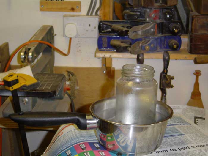 The pearl glue you buy will have instructions - follow them. In most cases, it’ll be something to the effect of covering the pearls with cold water overnight, then throwing that water away, covering the pearls with fresh water and heating in a glue kettle. Now a glue kettle’s an expensive bit of kit and you really don’t need one unless you’re using pearl glue all the time. I don’t own one (too mean with my money!). All they are is a means of heating the glue indirectly, using hot water. Below is a picture of how I do it.