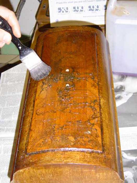 This is the way that I apply the stripper. I chose a fairly small area (in this case, just the top) and paint it, fairly thickly, over the whole area. Don’t try to economise with stripper – slap it on pretty thickly – but not so thickly that it starts to run down the sides. I then work across the same area, stabbing with the brush in a stippling action.