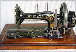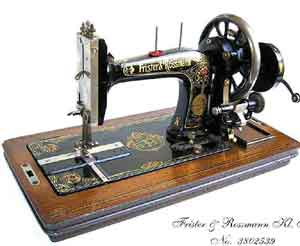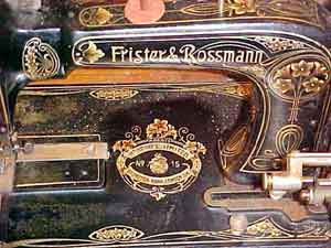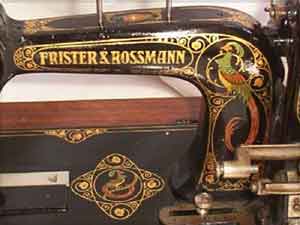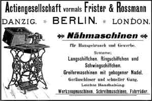Part of an Advertisement from 1869 The first machine advertised as an 'interpretation of the Wheeler and Wilson sewing machine'. Made in Berlin. Note the centre bar of the treadle stand closely imitates the genuine article. By 1873 - see below - the F&R logo has been added but the sides of the stand have changed to resemble the original Wheeler and Wilson |
