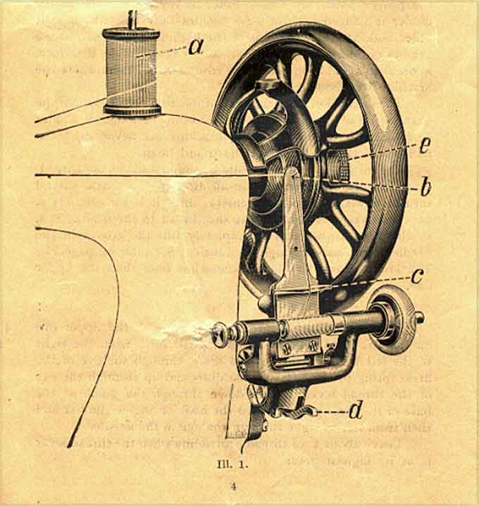 Lead the thread from the reel (a) on top of the arm of the machine first through the two tension discs on the thread lever cover plate, then backwards through the hole (b) of the knife blade and again downwards over the bridge (c) and fasten it by squeezing the end between the bobbin and right hand side spindle of the winder. Press the small lever (d) downwards and the rubber ring of the winder will come in touch with the hand wheel, slightly oil the left end of the bobbin and everything is ready for winding.