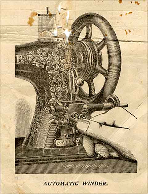 After disengaging the fly-wheel by undoing the coupling clutch, commence to wind, which will be effected with the greatest neatness and accuracy, as the winder requires no attention whatsoever, but will work quite automatically, and throw itself out of gear of its own accord as soon as the bobbin is sufficiently full. This automatic action renders it possible for the operator to wind a bobbin at the same time while sewing, but it is best to always effect the winding separately because, of course, simultaneous sewing and winding will always make the machine run harder.