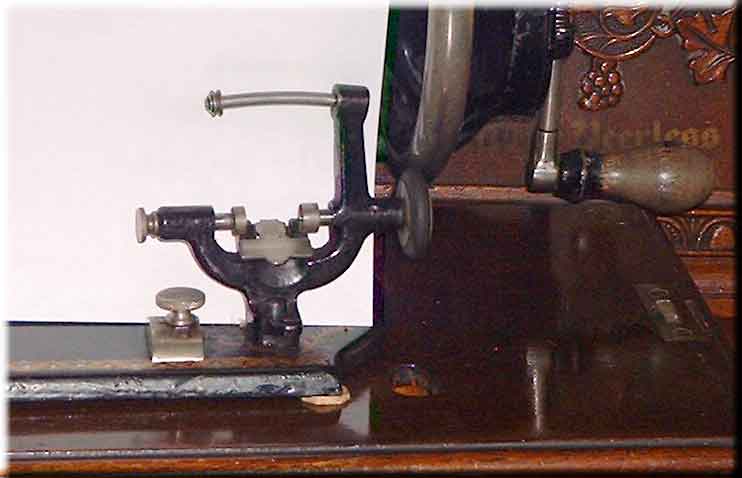 Take hold of bobbin winder and turn it to position, that is so that the rubber pulley comes in contact with the wheel; slip th clutch out of the wheel so that the wheel will revolve without running the machine; place bobbin in winder, and spool of thread on spool standard, pinch the end of thread between the right hand end of bobbin and winder, and with left hand pass thread up back, and over small grooved pulley on the curved shaft at top of winder, and down through slotted hole at bottom of frame in front of bobbin winder; raise spring pad to rest against bobbin; now proceed to wind by turning wheel as if sewing, and the bobbin will wind itself automatically as smooth as a spool of silk.