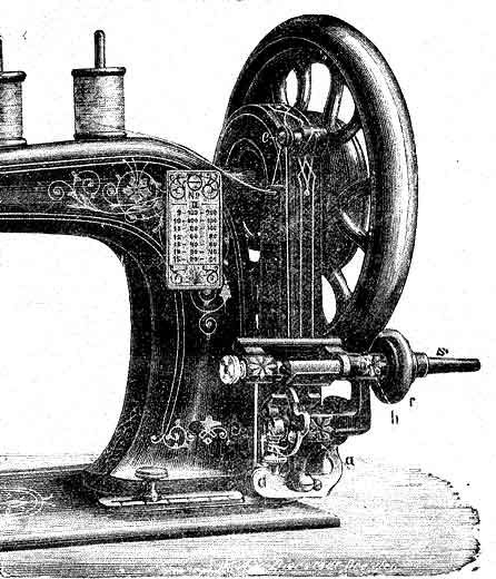 Having now the bobbin properly threaded in its position, press the little lever (a) under the thread pressure plate, which will cause the latter to spring flat against the bobbin; a second pressure against (b) will bring hte India rubber ring in contact with the fly wheel.
