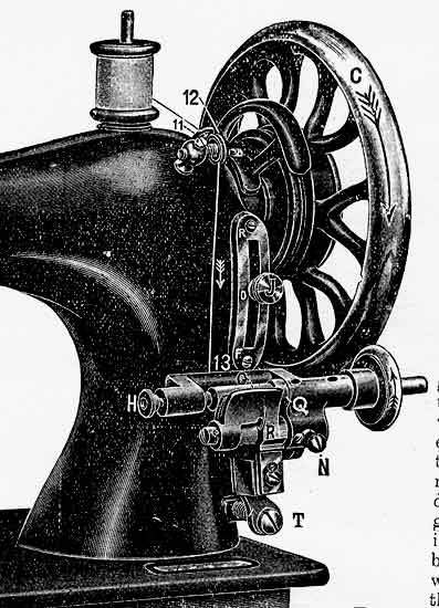 From the inside now press down the gate (R) and insert the bobbin in the winder so that the at the end fits over the driving pin (Q), draw out the piston (H) and place the other end of the bobbin in position; then push up firmly the knob on winder at point (N), listening closely for two distinct clicks which ensure that the rubber ring is in contact with the balance wheel (C), and proceed to wind bobbin by turning the handle of the machine.
