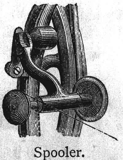 Then wind the bobbin by operating the treadle, holding the thread firmly between the thumb and finger, and allowing it to pass from one side of the bobbin to the other, that it may be wound tight and even.