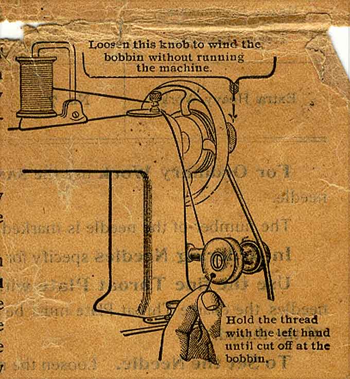 Wind the thread from the spool on the machine once around the arm cap screw on top of the arm, near the hand-wheel, and pass the end of the thread from the inside through the hole in the bobbin; hold the thread firmly until a few turns of the winder cuts off the thread at the bobbin. Be sure that the thread is cut off and does not hang out of the hole in the bobbin to make bad sewing. If necessary, guide the thread with a touch of the finger.