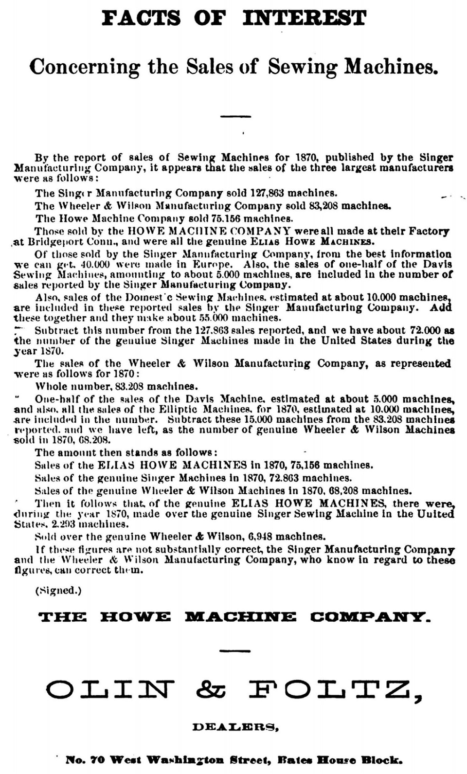 The Howe Machine Company advertised in Ladies Own Magazine (Figure 4)13 that Singer’s yearly totals were greatly inflated by the fact that Davis, Domestic, and Singer’s international sales were included, and Wheeler & Wilson’s totals were inflated by Davis and Elliptic machines. Howe’s math indicated they deserved top honour for the most sales in 1870.